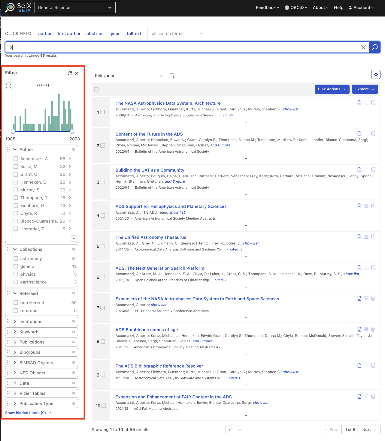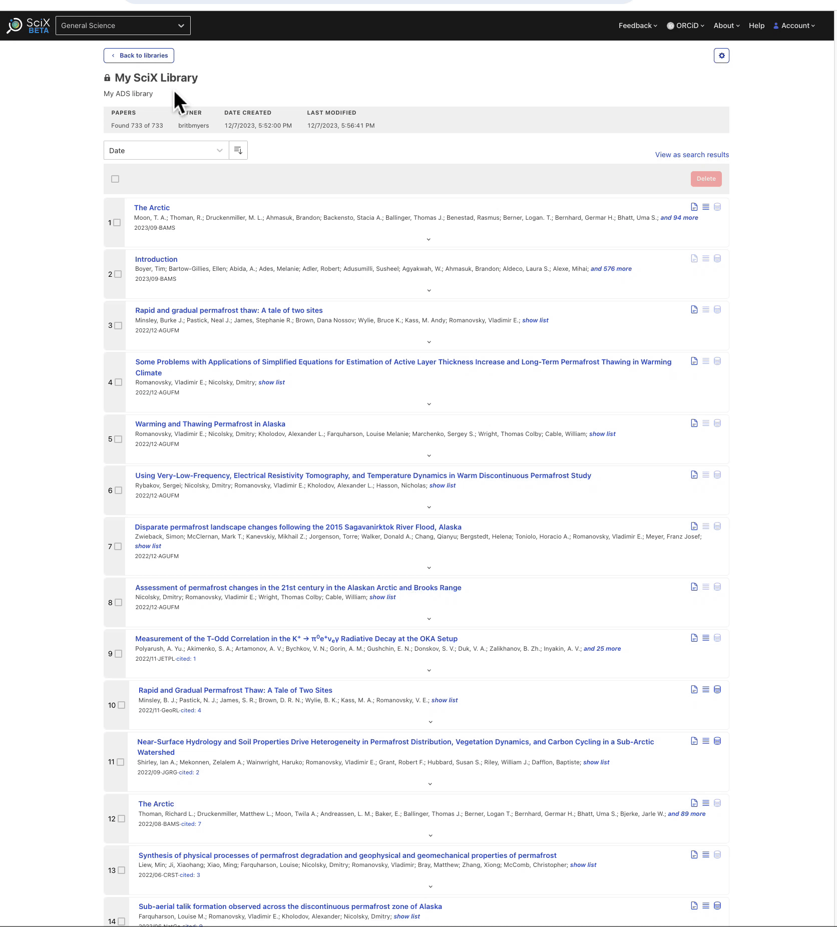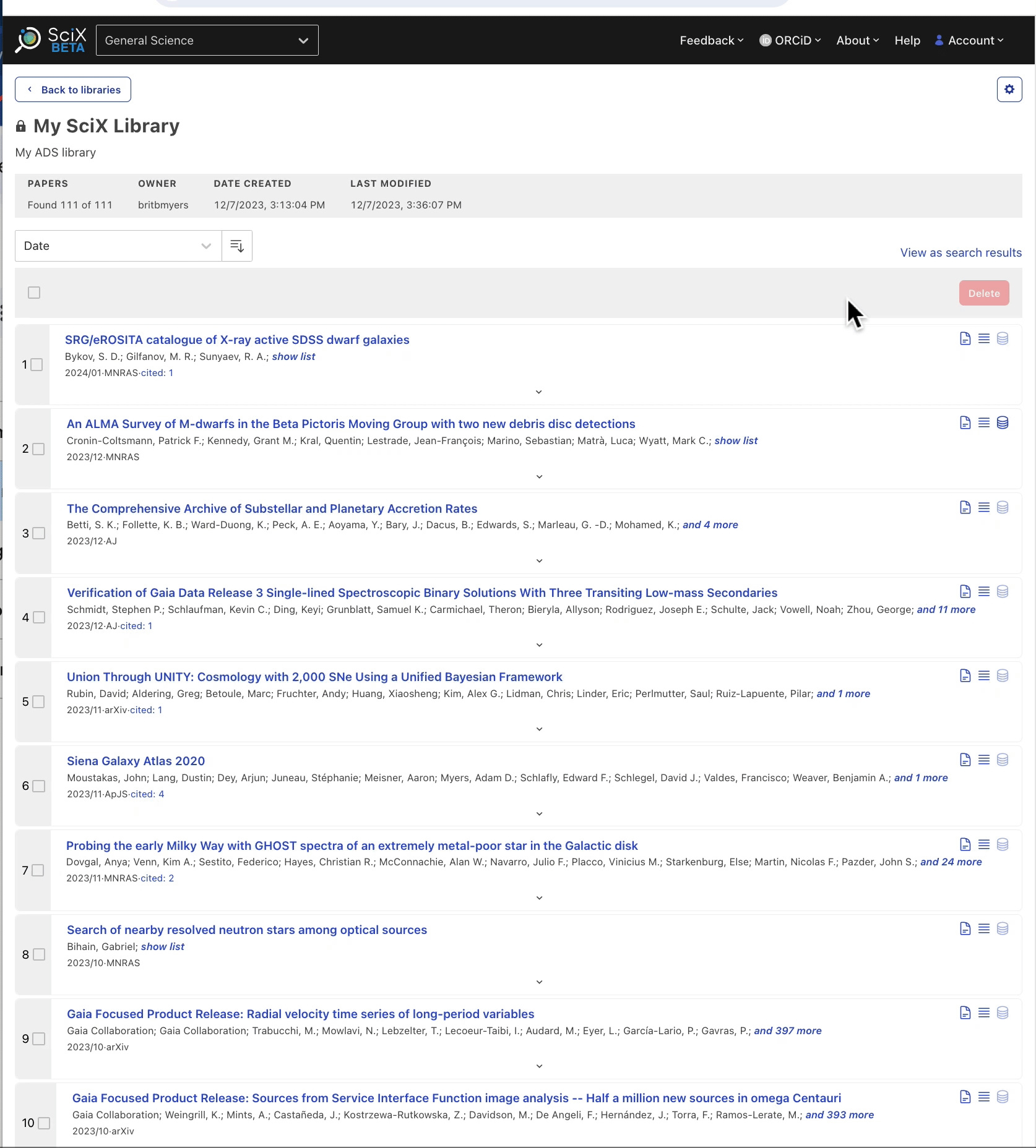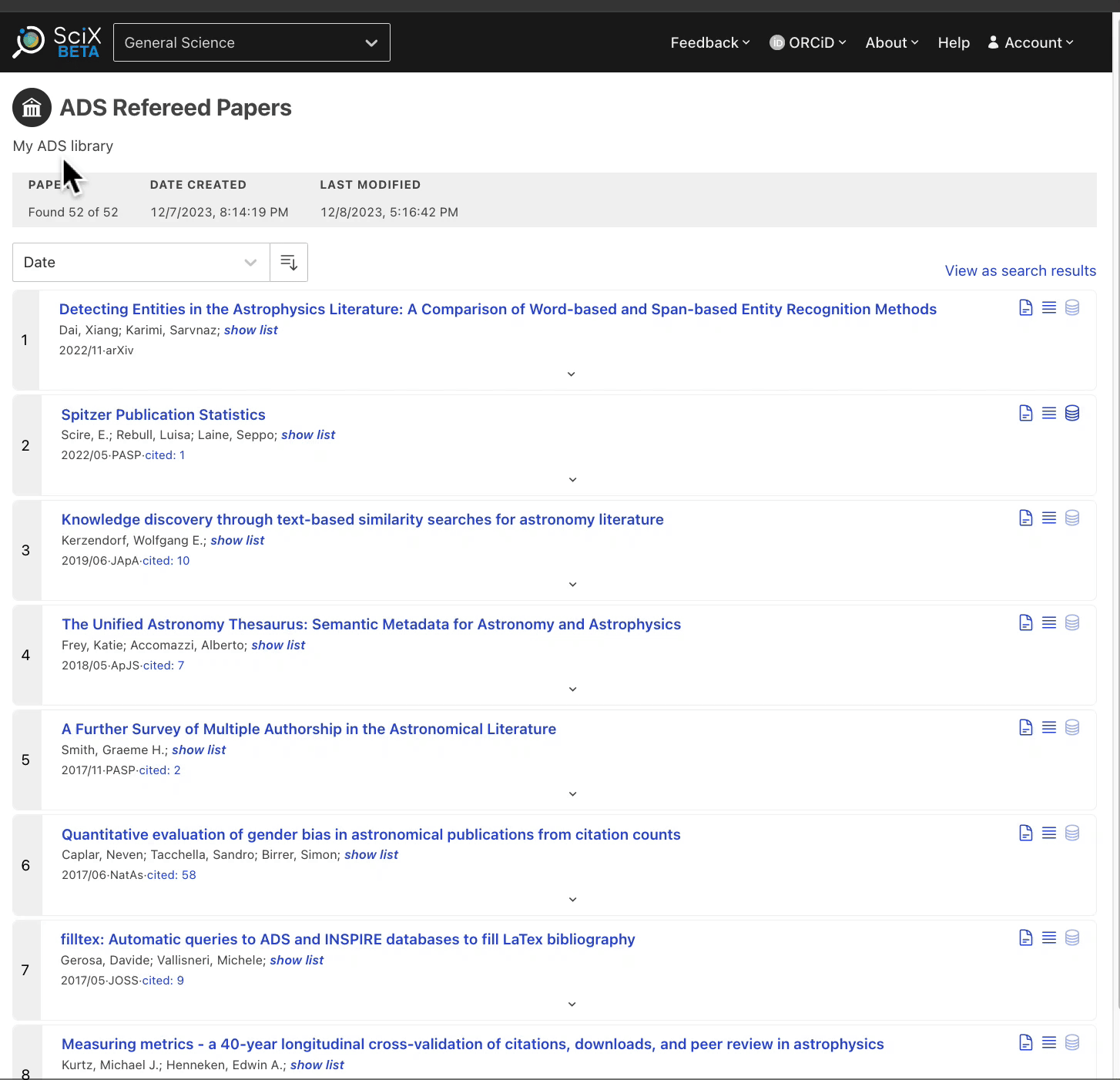 SciX libraries allow you to save collections of papers to view later. These libraries can be private (by default) or public. In addition to viewing and sorting saved papers, you can export the collection in a variety of formats, view citations and other metrics, explore visualizations such as the paper or author networks, and check for related papers. Libraries are a popular way to build reference lists when writing papers, or keeping one’s bibliography to use in a CV.